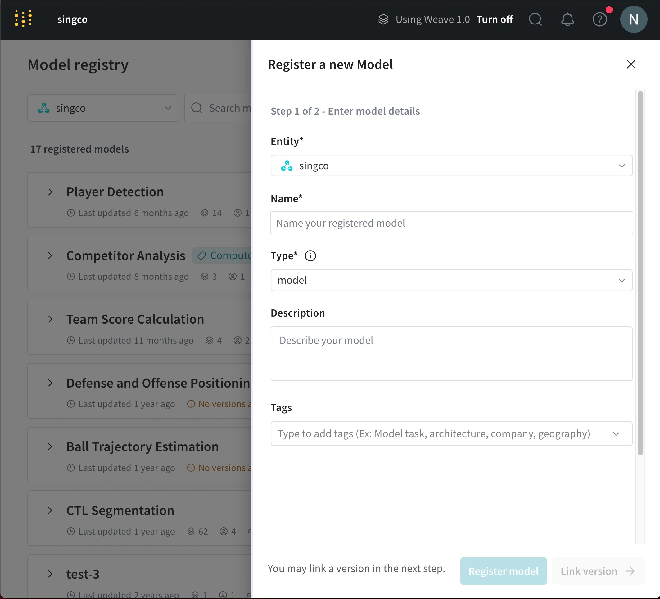 1. 表示されたパネルから、registered model が属するエンティティを Owning Entity ドロップダウンから選択します。