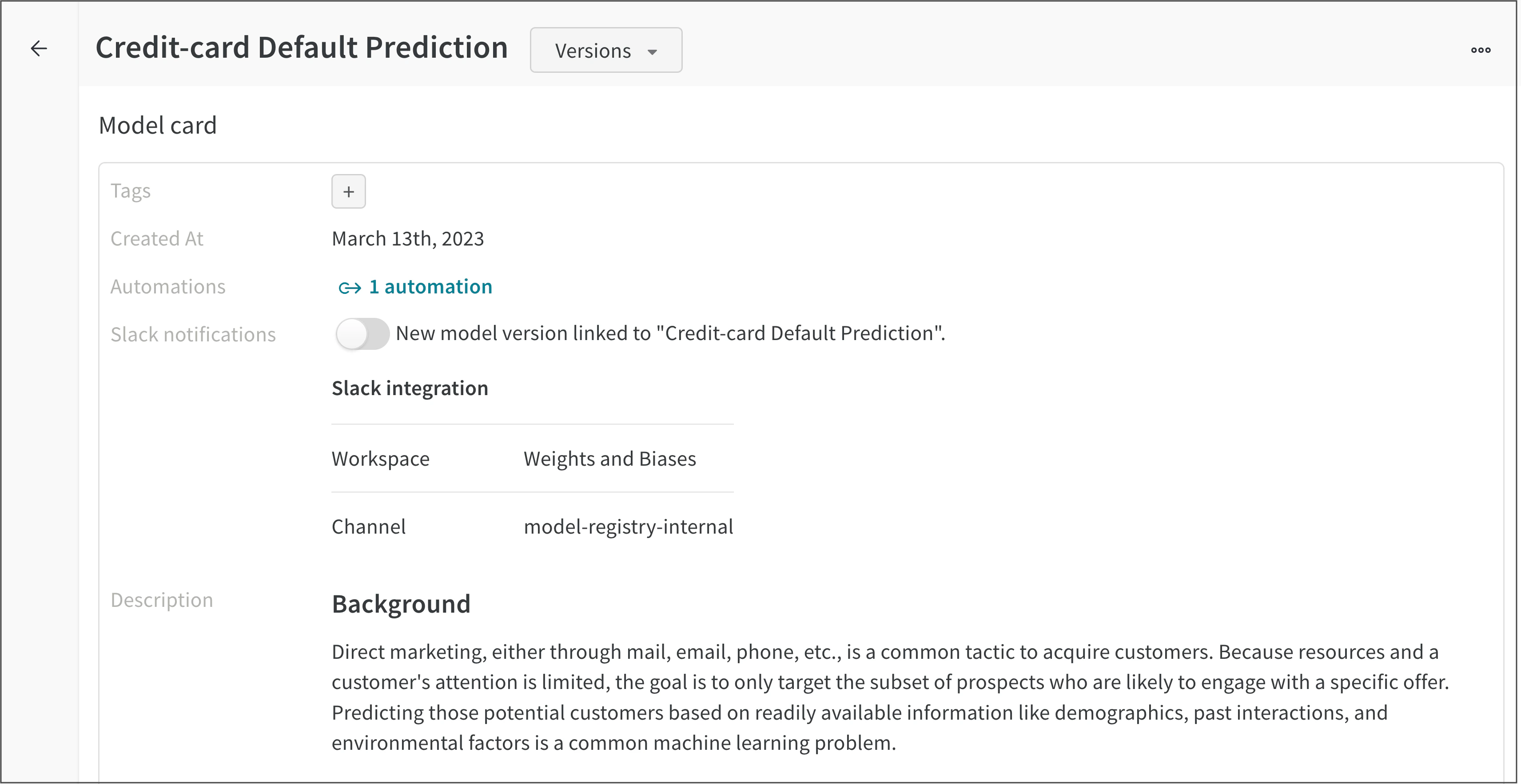 예를 들어 다음 이미지는 신용카드 채무 불이행 예측 등록 모델의 모델 카드를 보여줍니다.